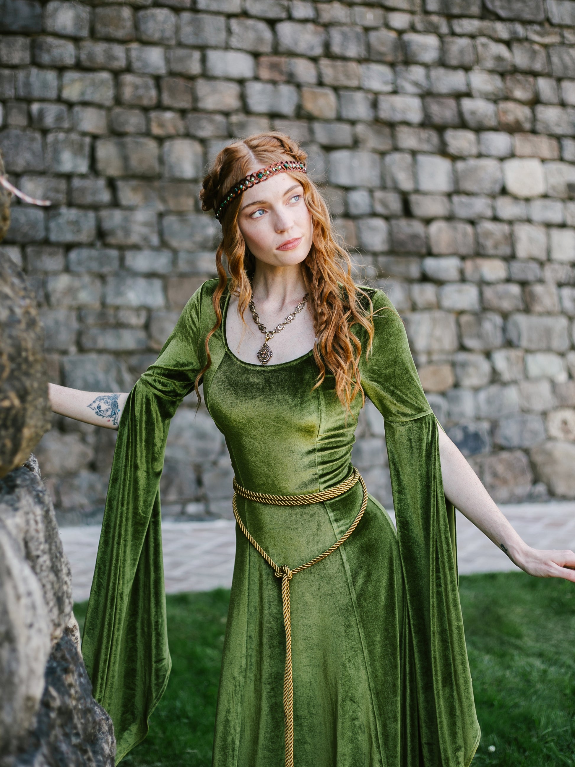 Enter your medieval era with our Velvet Bell Sleeve Dress. This stretch velvet fabric creates a snug and comfortable form fitting silhouette in a rich green chartreuse color. Adjustable back lacing allows for an even more tailored fit and long bell sleeves with slits create a flowing, draped effect reminiscent of medieval styles.