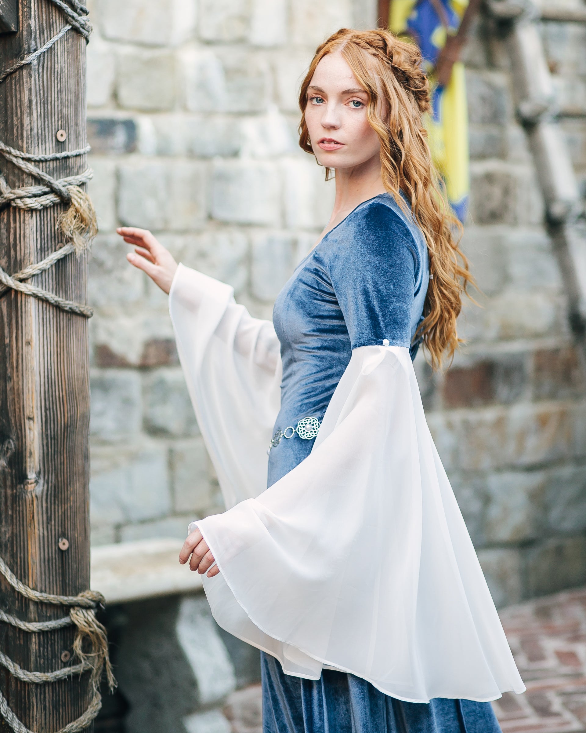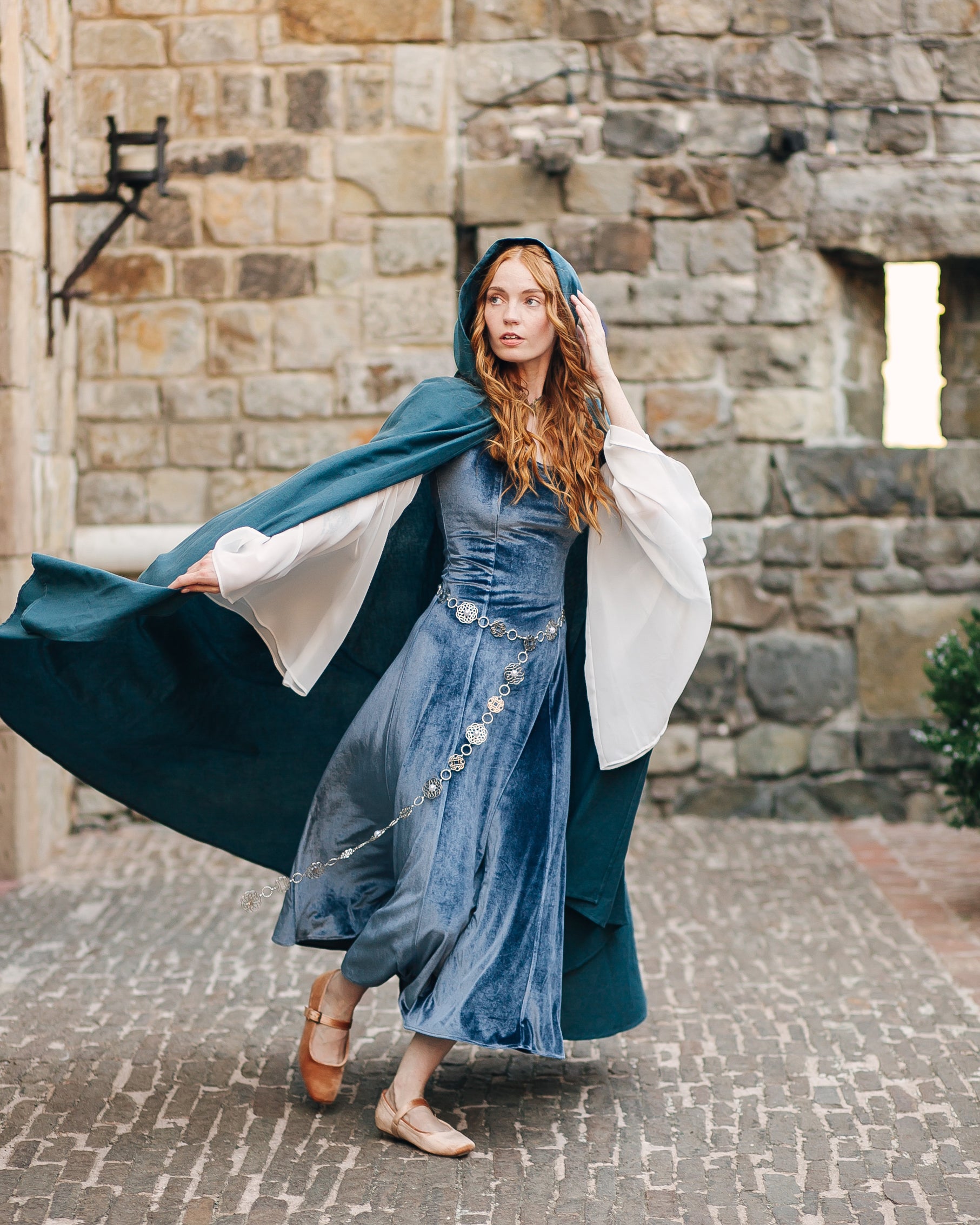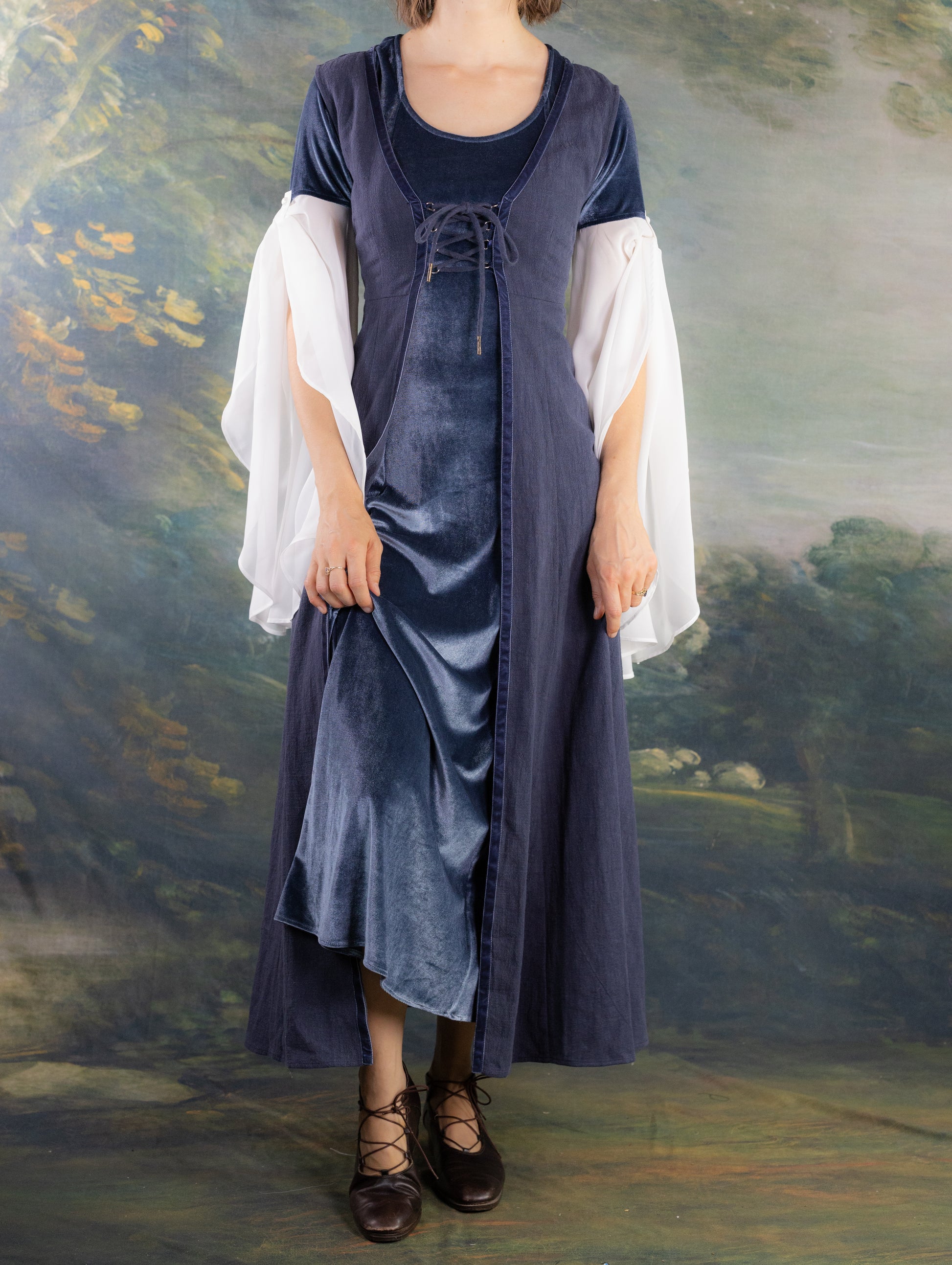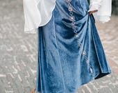 Cloak yourself in the threads of immortality with our Elven Blue Velvet Bell Sleeve Dress. This stretch velvet fabric creates a snug and comfortable form fitting silhouette in a lush steel blue color with gracefully sheer chiffon sleeves. Adjustable back lacing allows for a tailored fit and long bell sleeves create a flowing, draped effect reminiscent of medieval styles. The chiffon sleeves can be buttoned up for convenience or let down for maximum drama.