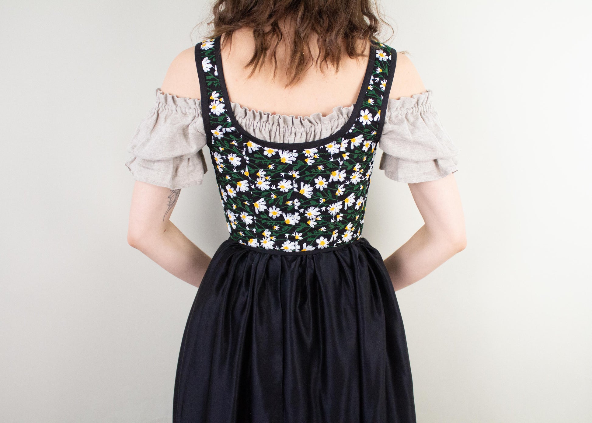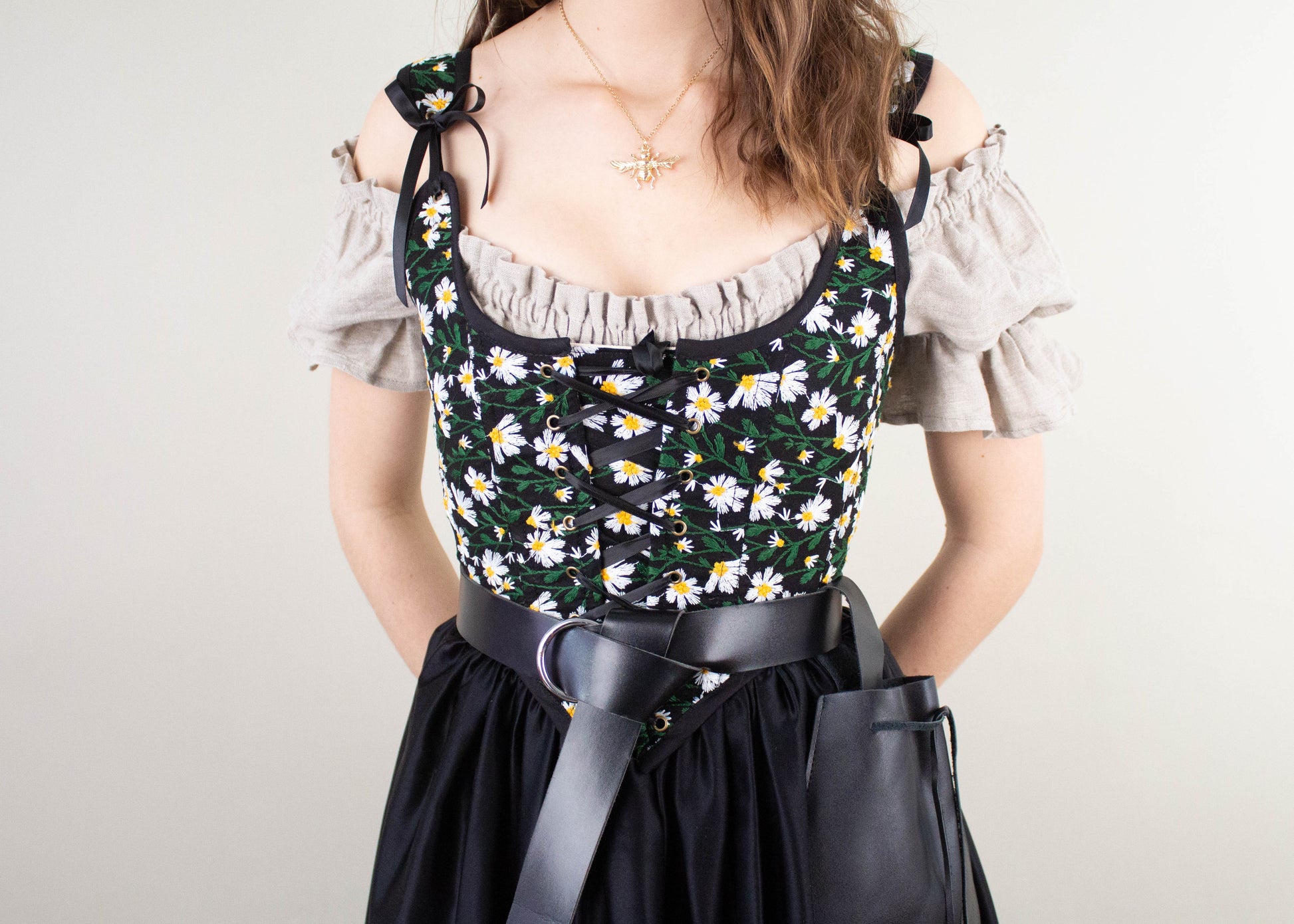 This corset fabric features hundreds of embroidered white daisies on a black background. This 100% cotton fabric is strong and breathable, and this corset will hold up to many wears for years to come.