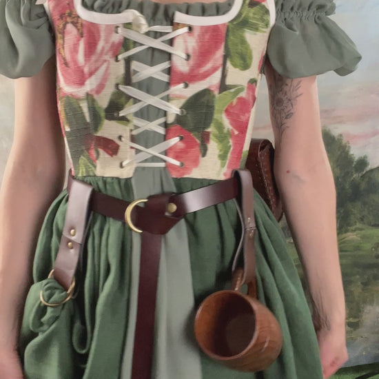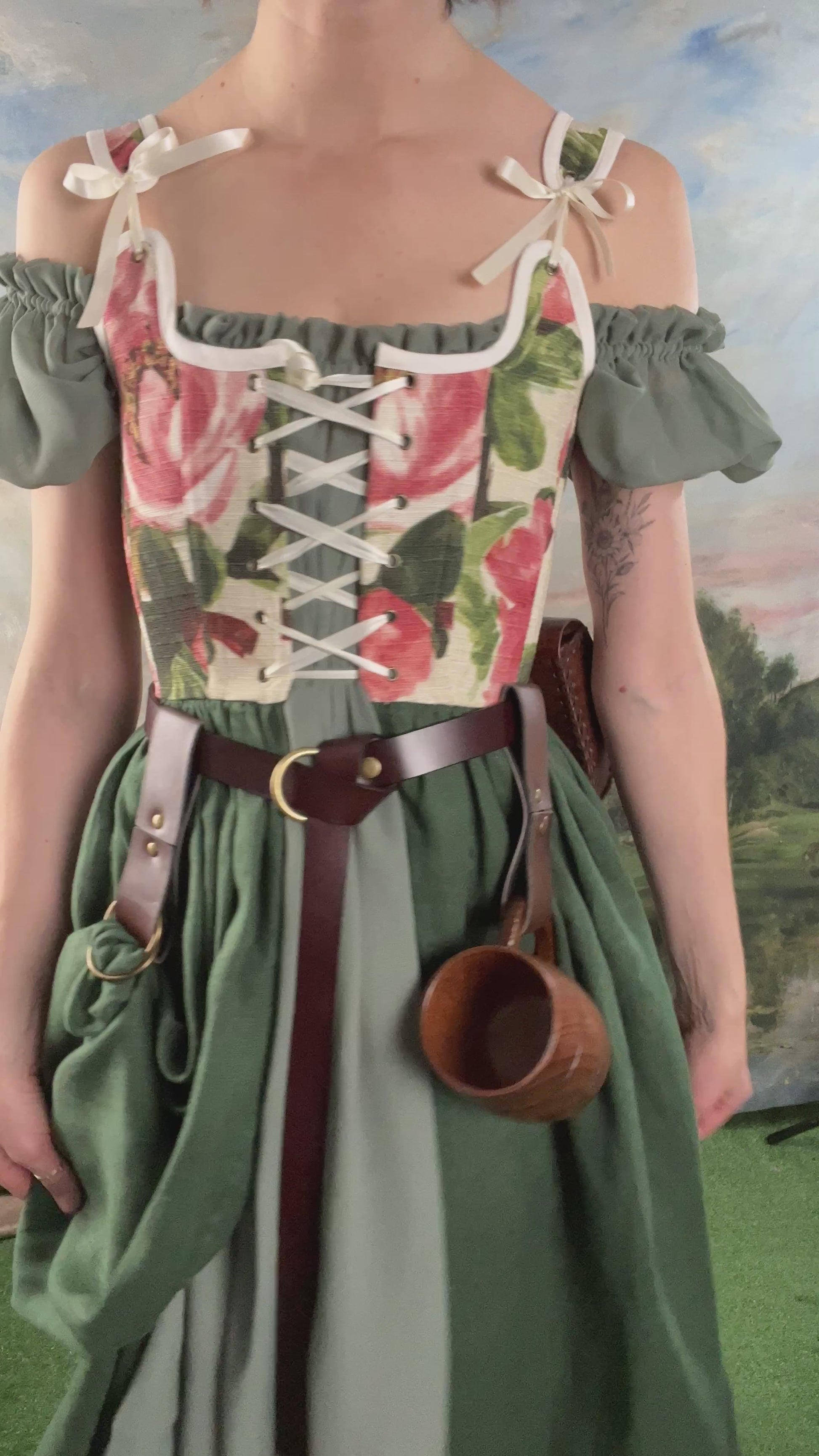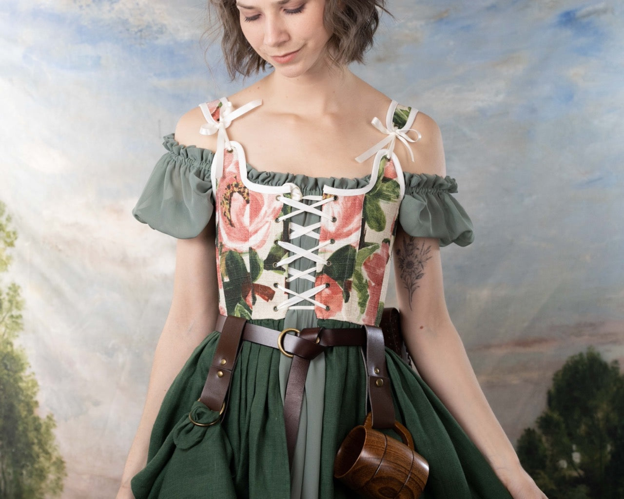 Crafted from the finest quality linen, this dress features a beautiful pink floral and green leaf print that evokes a sense of natural beauty and femininity. The corset top is expertly crafted with intricate lacing that enhances your curves and gives you a sleek and elegant silhouette.
