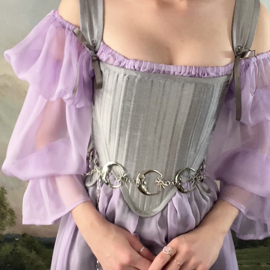 Embrace the enchanting world of lady knights and moonlit adventures with our Silver Dupioni Tabbed Tudor Stays. Crafted with high-quality silver dupioni fabric, this corset is the perfect addition to any knightcore-inspired wardrobe.