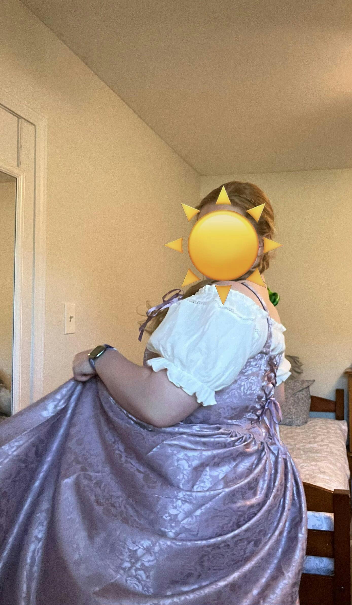 Create your own Rapunzel, Last Unicorn, or Fairy Queen look with this lavender satin jacquard corset dress. This shimmering floral-patterned purple fabric catches the light beautifully, adding a touch of magic to every movement.