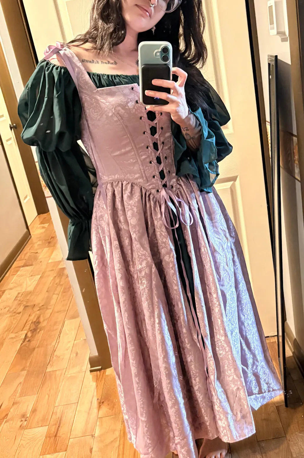 Create your own Rapunzel, Last Unicorn, or Fairy Queen look with this lavender satin jacquard corset dress. This shimmering floral-patterned purple fabric catches the light beautifully, adding a touch of magic to every movement.