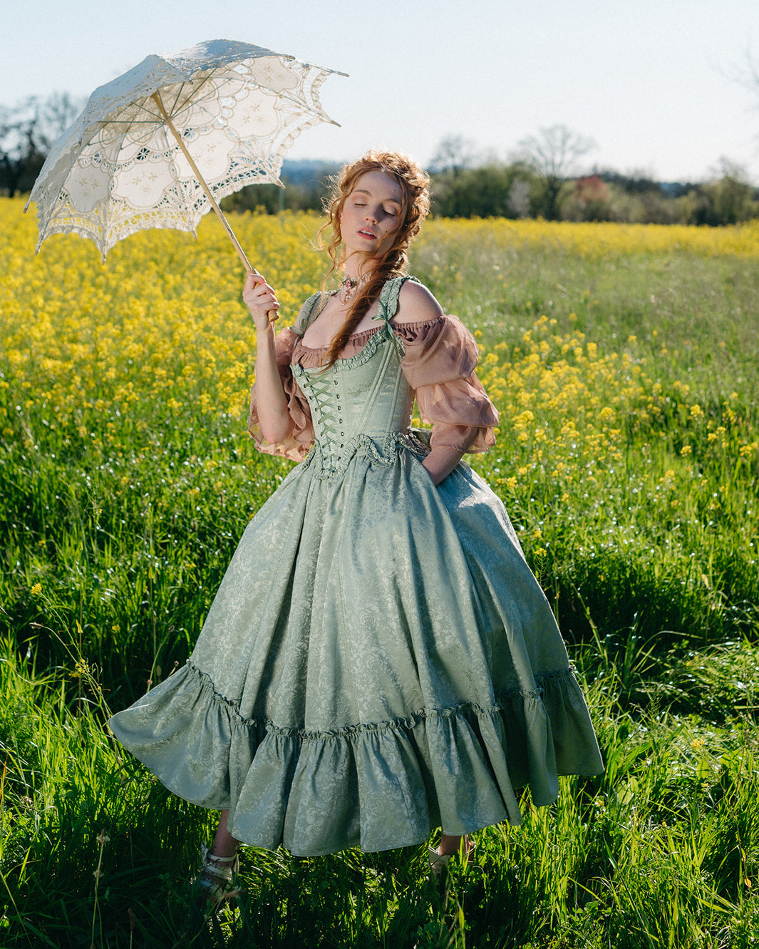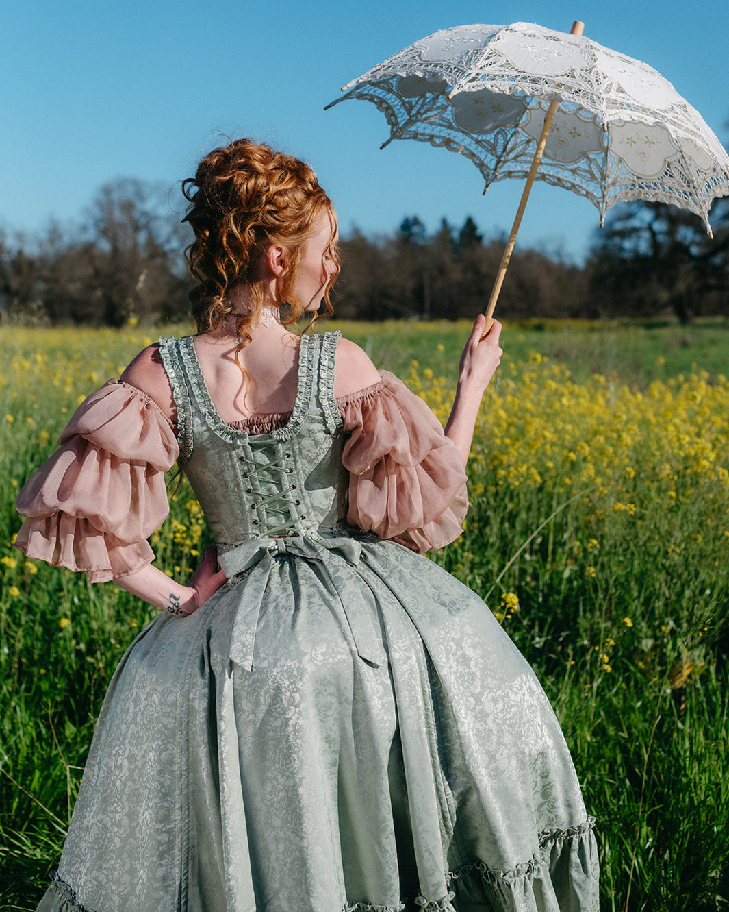 Wear it over a petticoat, panniers, and a bustle pad for extra shape, layer it over another skirt to show off contrast underneath, or keep it simple with a chemise or blouse for something more everyday cottagecore.